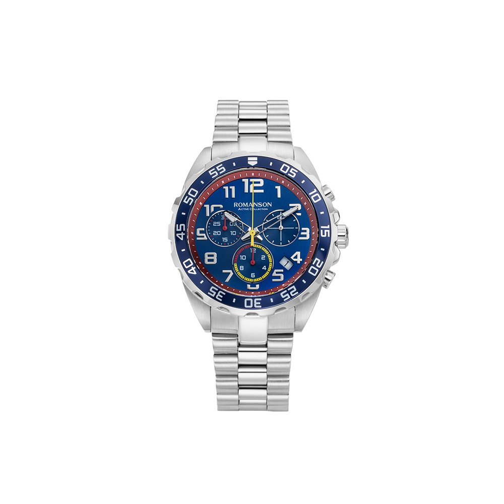 The Romanson AM0001HMWBU Men’s Chronograph Watch is a bold and stylish timepiece that combines Swiss precision with modern design. It features a 41mm stainless steel case with a striking blue chronograph dial, paired with a matching stainless steel bracelet.