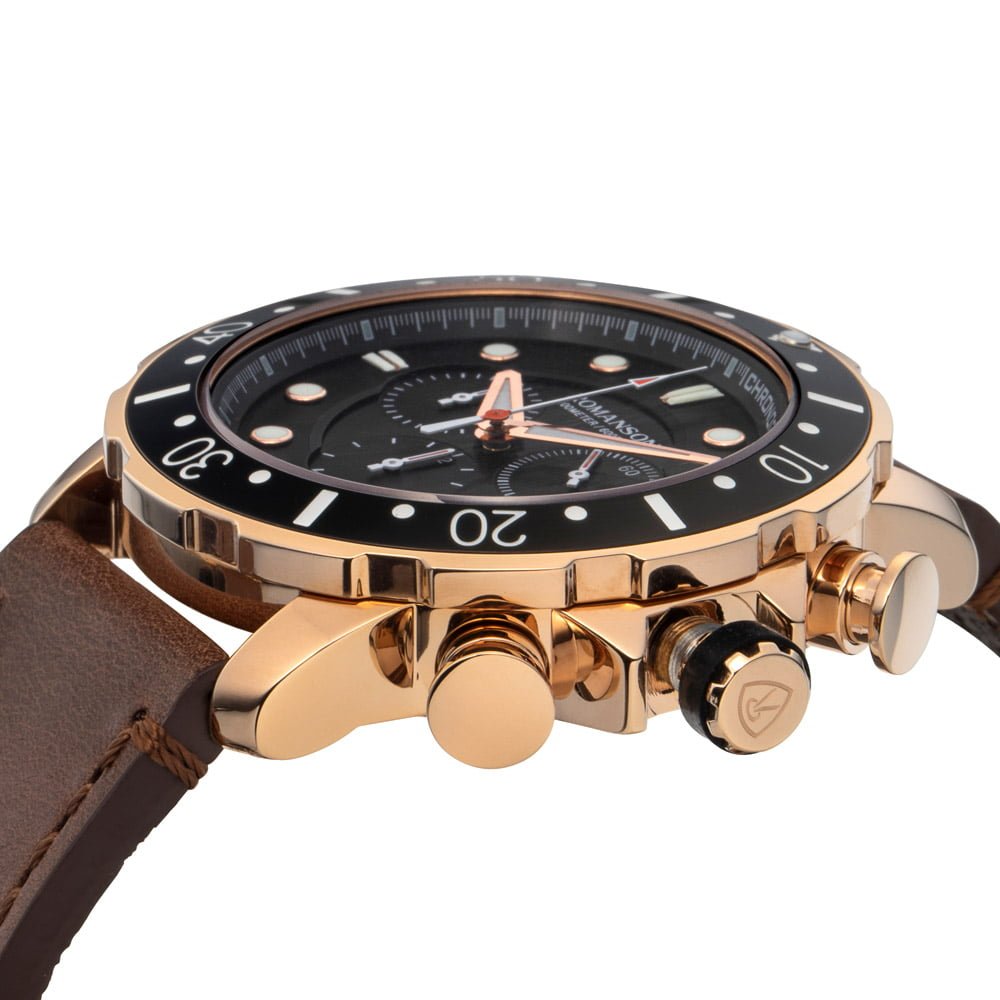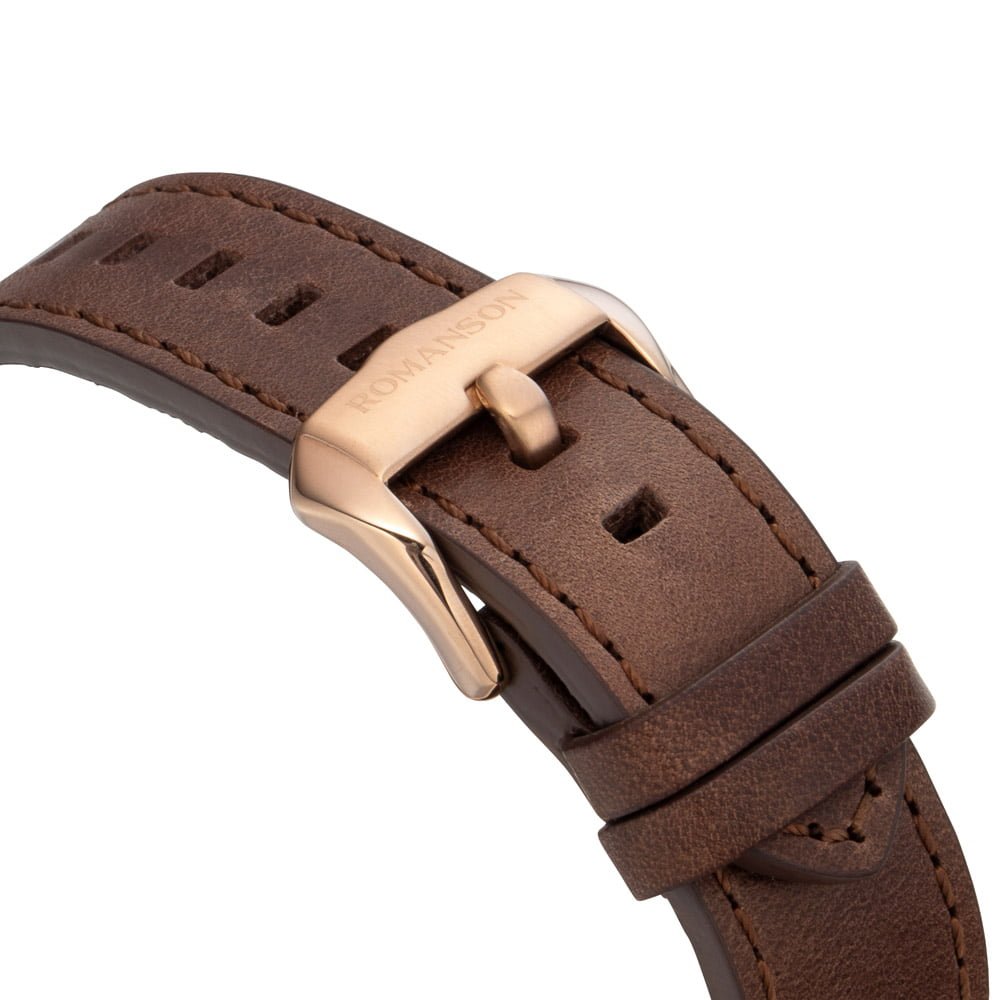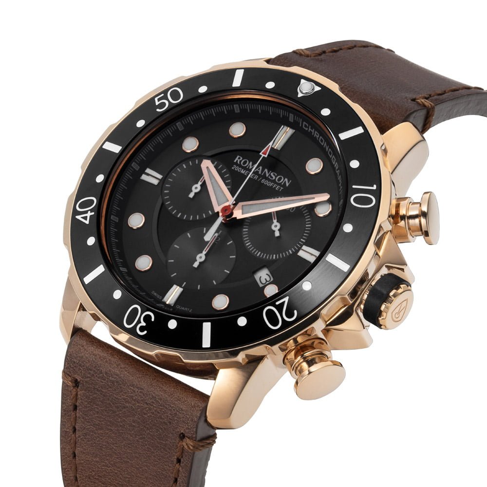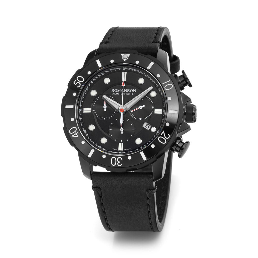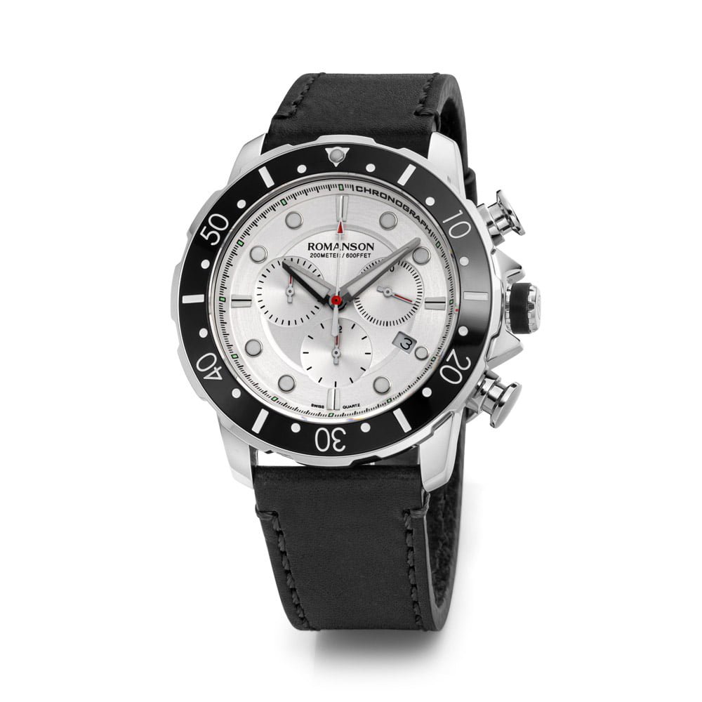 Make a bold statement with this distinguished timepiece. The commanding black dial, enhanced by precision chronograph features, is paired seamlessly with a luxurious leather strap. This Romanson watch combines contemporary design with functionality, offering a sophisticated accessory for the modern man. Elevate your style with this chronograph watch that effortlessly balances rugged charm and refined elegance.