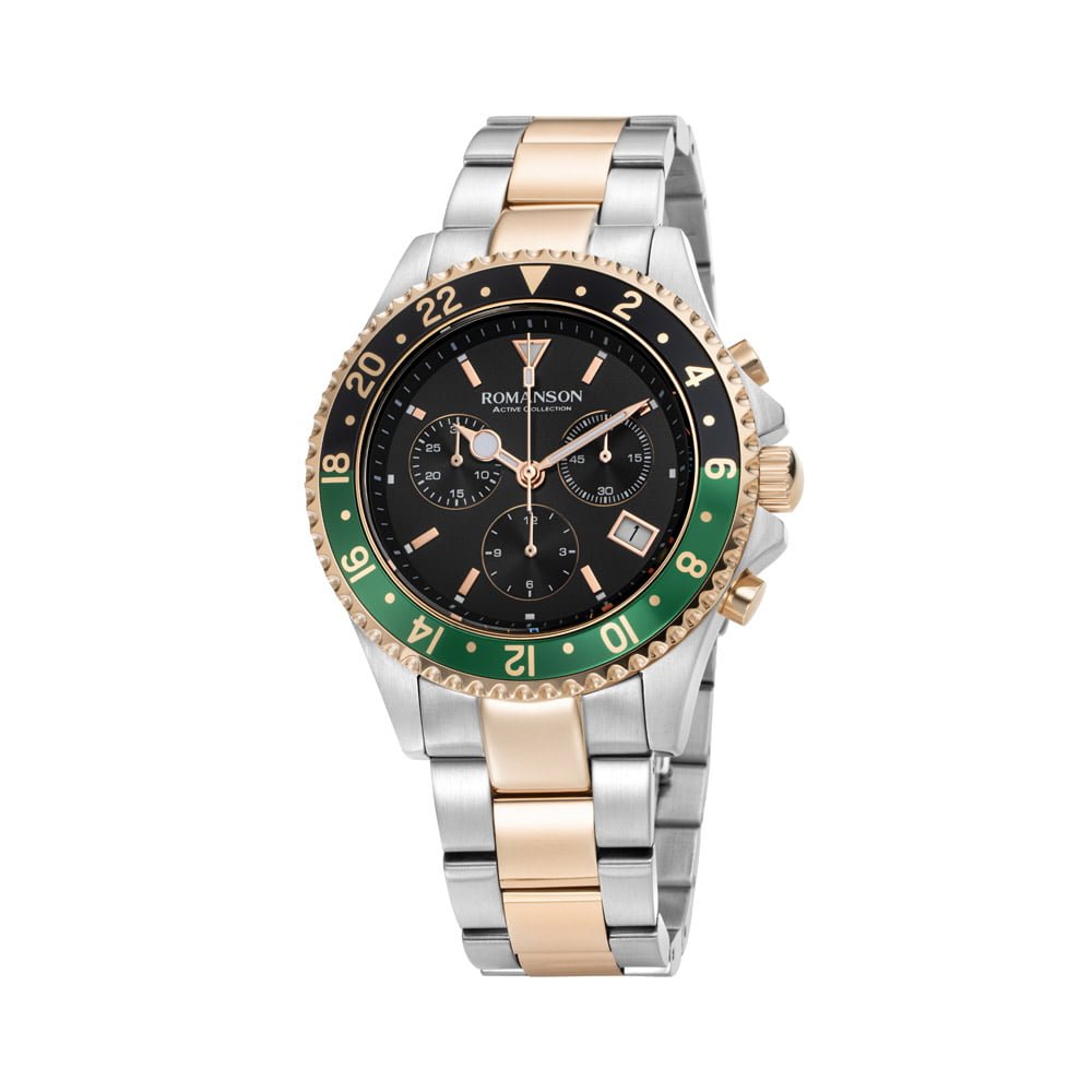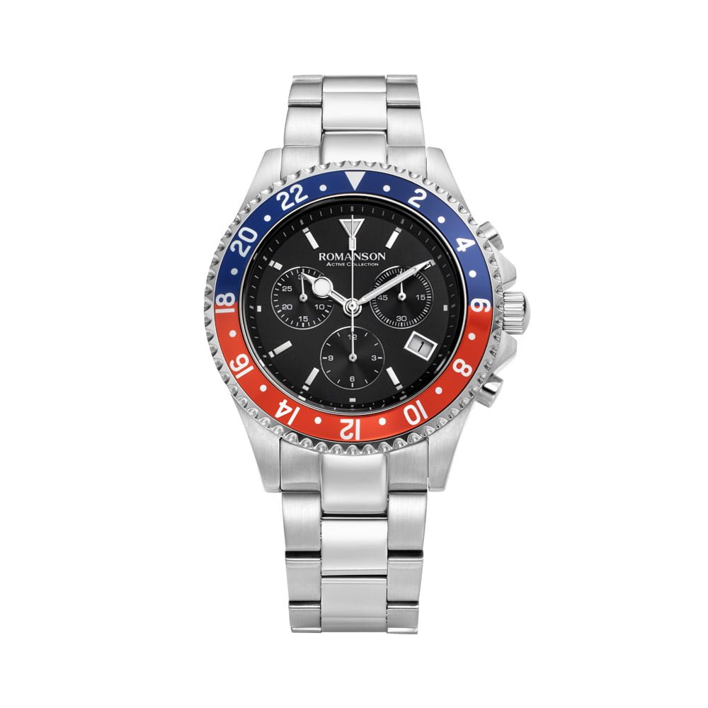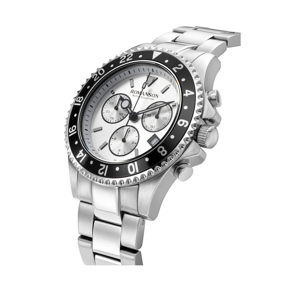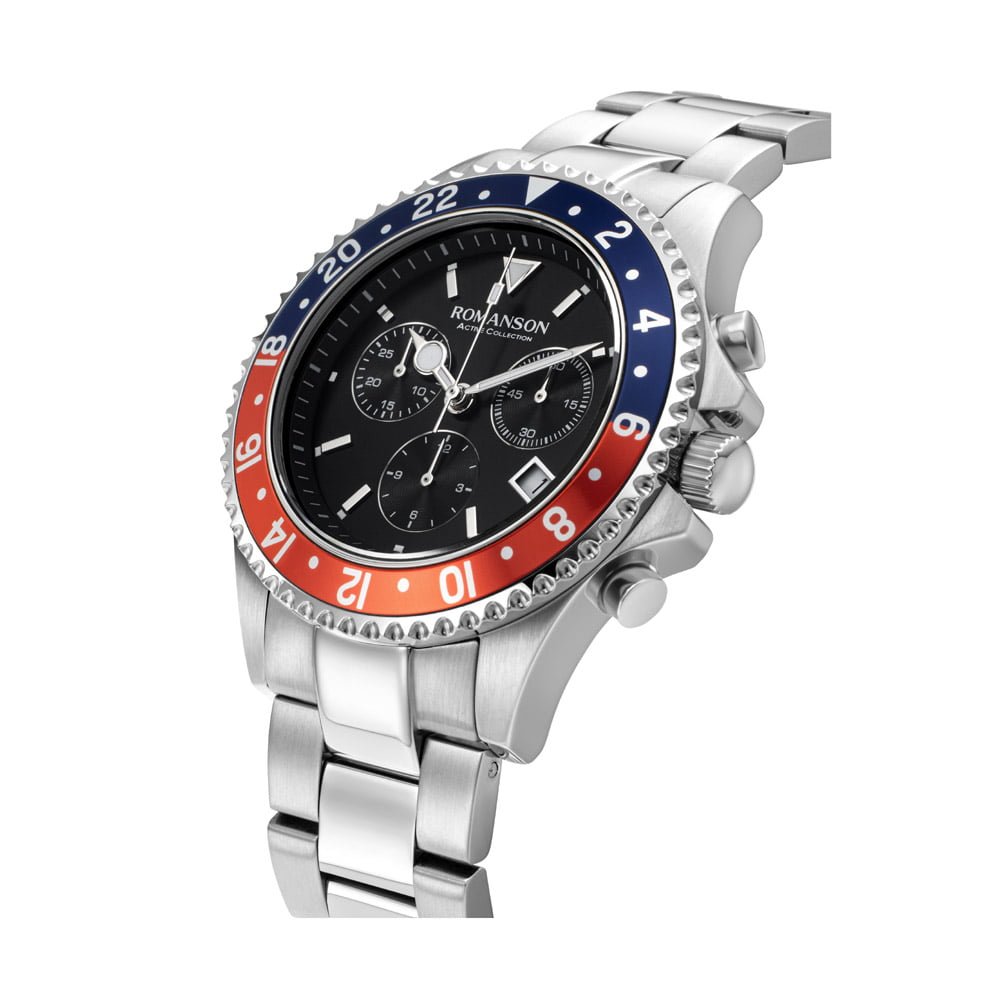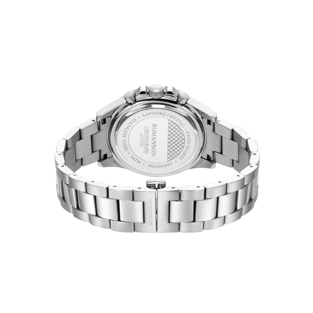 Elevate your wrist game with this striking timepiece. The black dial exudes boldness, while the stainless steel strap ensures durability and a modern edge. Precision meets style with the chronograph feature, making this Romanson watch a perfect companion for those who appreciate both functionality and sophistication. Make a statement with every tick.