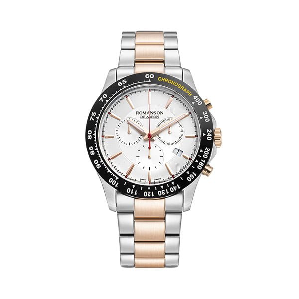 Elevate your wrist game with this striking timepiece. The black dial exudes boldness, while the stainless steel strap ensures durability and a modern edge. Precision meets style with the chronograph feature, making this Romanson watch a perfect companion for those who appreciate both functionality and sophistication. Make a statement with every tick.