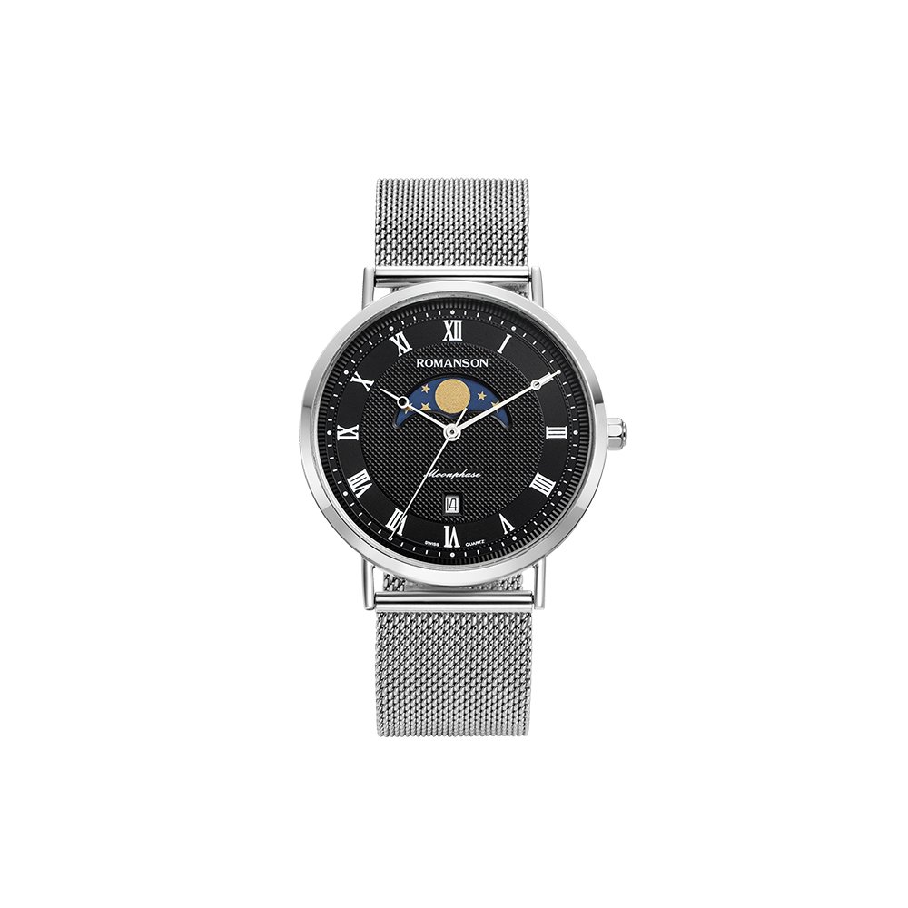 Discover the perfect blend of classic functionality and contemporary style with the Romanson TM1B24FMWBK watch. This remarkable timepiece features a 39 mm round stainless steel case with a sleek silver-tone finish. Its most captivating feature is the integrated moon phase complication, which adds a touch of sophisticated charm to the watch.